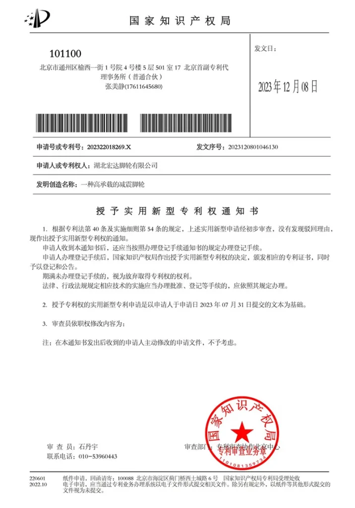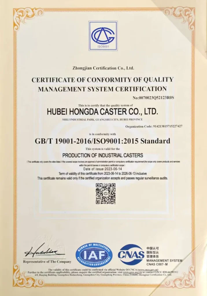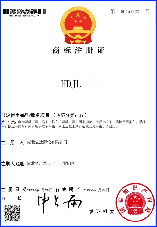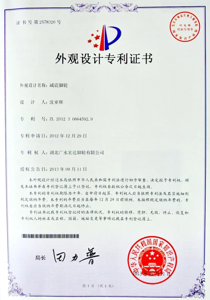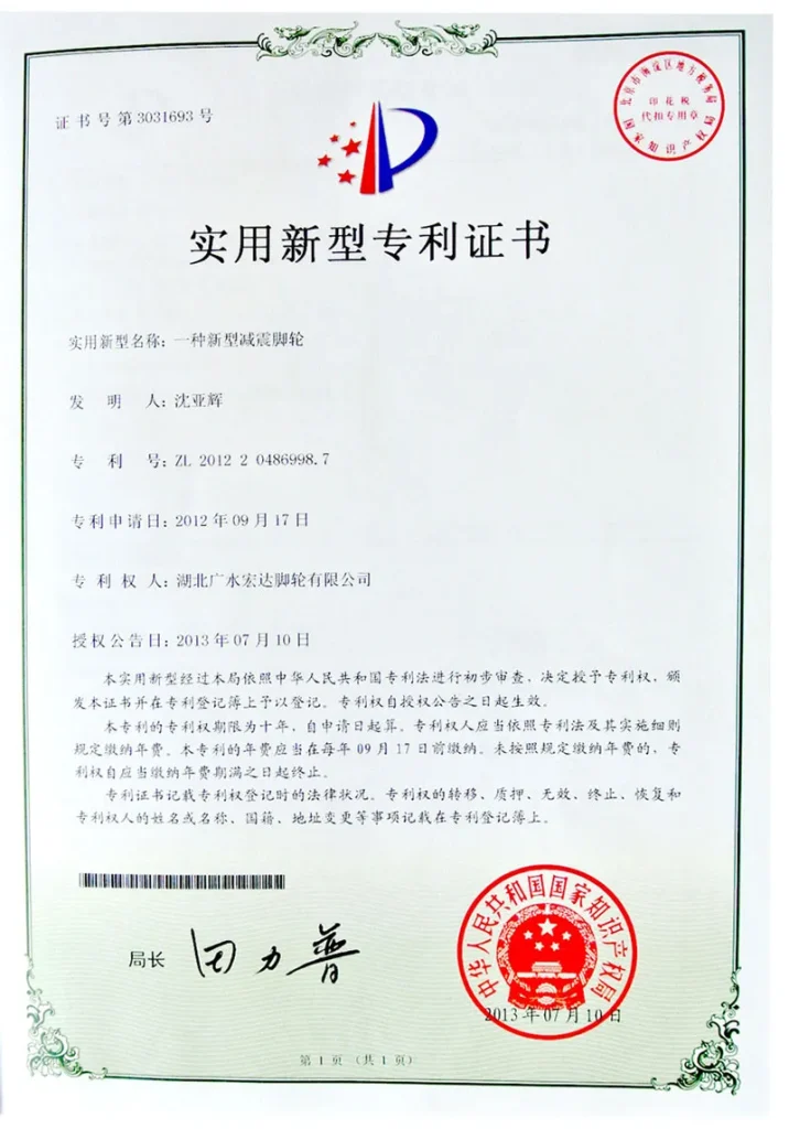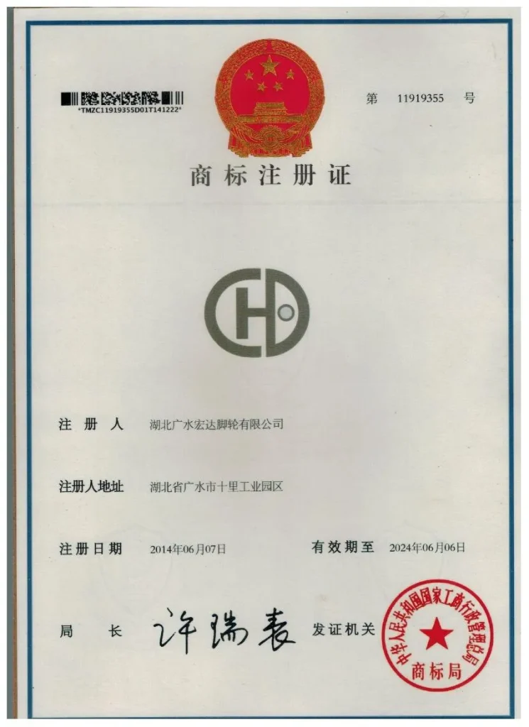 ООО Хубэй Хунда Роликовые Колеса обладает почти двадцатилетним опытом в области разработки и производства. Мы первыми в отрасли получили национальный сертификат системы менеджмента качества ISO9001, сертификаты системы экологического менеджмента, статус высокотехнологичного предприятия, а также признаны предприятием военно-гражданской интеграции провинции Хубэй. Кроме того, нами получены 14 национальных патентов на полезные модели.